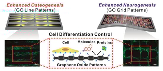 Effects of GO micropatterns on stem-cell differentiation. Enhancement of osteogenic and neuronal differentiation, using microcontact-printed GO substrate with line and grid patterns. Fluorescence image of stem cells stained with F-actin. Scale bar = 100 μm. Reprinted with permission from Kim et al. [].
