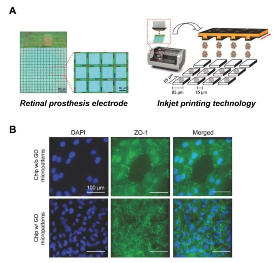 Improved biocompatibility of RPE cells with retinal prosthesis electrode attachment through GO patterns. (A) Schematic of the GO micropatterns generated on the electrodes by inkjet-printing technology. (B) Fluorescence image of cells stained with tight junction protein marker, ZO-1. The GO-micropatterned interface showed enhanced cell adhesion and barrier function on the retinal prosthesis electrode substrate. Scale bar = 100 μm. Adapted with permission from Yang et al. [].