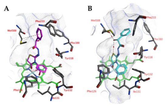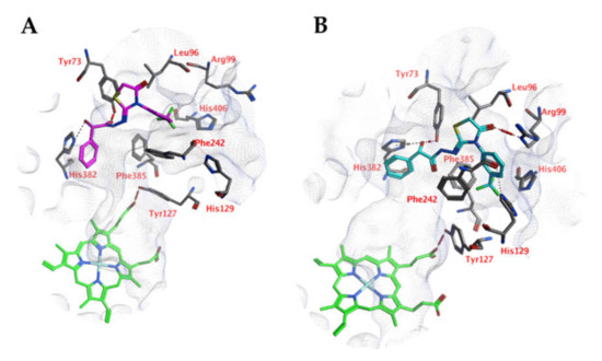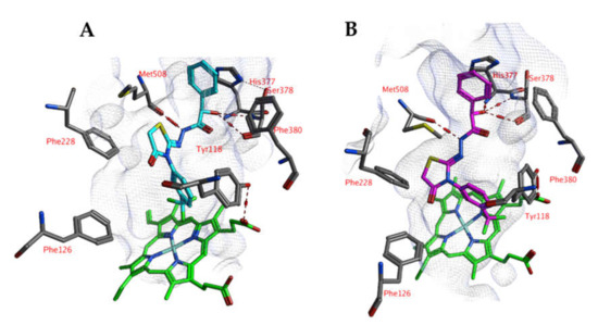 (A) The docked pose of compound 4h (turquoise) in the active site of CaCYP51 (PDB: 5v5z). (B) The docked pose of compound 4h (purple) after a 5-ns molecular dynamics simulation. The haem group is indicated in green sticks. The pocket surface is indicated with a white mesh. Hydrogen bonds are indicated in red dashed lines.