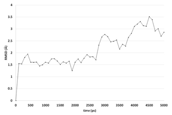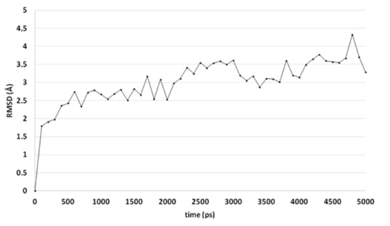 The RMSD of the ligand heavy atoms during the 5-ns molecular dynamics simulation of compound 4h in the active site of CaCYP51.