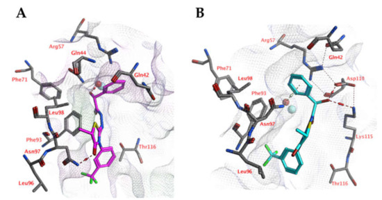 Crystal structures of Candida albicans (CaCYP51a1; PDB: 5v5z; 2.9 Å) and Candida glabrata (CgCYP51a1; PDB: 5jlc; 2.4 Å) CYP51a1 enzymes, both in complex with itraconazole, have been obtained from the RCSB Protein Data Bank. Buffer molecules, ions, and water molecules were deleted if present (only in 5jlc), and the protein atoms, haem atoms, and iron atoms were retained. Hydrogen atoms were added according to the protonate 3D protocol found in the MOE package [44]. Subsequently, the structures were subjected to energy minimization using a steepest-descent protocol (applied (AMBER14:EHT force field).