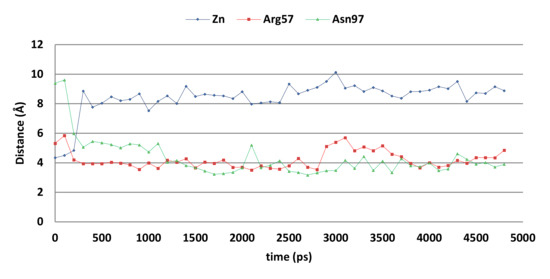 However, molecular dynamics simulations indicate that the docked pose may not be stable (Figure 9). The overall distance between the ligand’s hydroxyl group and the active site zinc ion increases significantly during the first 500 ps of the simulation, while the distances between the ligand’s unsubstituted phenyl group (centroid) to the Arg57 side chain (atom Cz) and Asn97 side chain (atom ND2) decreases. As a result, cation-π interactions with Arg57 and hydrogen-arene interactions with Asn97 can be formed after 500 ps.