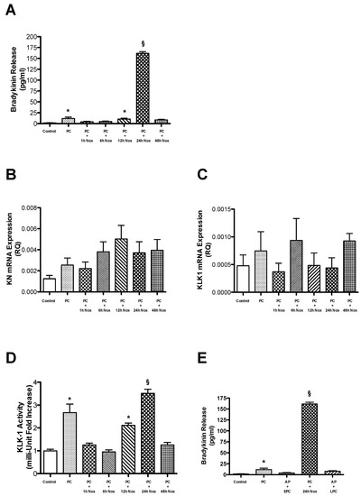 Cells were subjected to preconditioning (PC). (A) Bradykinin (Bk) production was assessed at different times following PC (Nox: normoxia). The bar graph shows the concentration (mean ± SEM) of Bk, representative of four independent experiments. The transcription of the mRNAs coding for (B) kininogen (Kn) and (C) tissue kallikrein (KLK1) was assessed at different times following PC. The bar graph represents the mean ± SEM, expressed as the RQ value, of four independent experiments. (D) KLK1 activity was assessed at different times following PC. The bar graph shows the mean ± SEM, expressed as the fold increase in KLK1 activity over that in control cells, of five independent experiments. (E) Bk synthesis was measured in early and late preconditioned cells, in the presence and absence of a KLK1 selective inhibitor, aprotinin (AP). The bar graph shows the concentration (mean ± SEM) of Bk, representative of three independent experiments. Nox: normoxia. * p < 0.001 vs. control; § p < 0.001 vs. control and PC, by one-way ANOVA with a post hoc test of HSD.