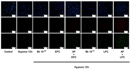 Cells were subjected to prolonged hypoxia (12 h) after early and late preconditioning (EPC and LPC), in the absence and presence of aprotinin (KLK1 selective inhibitor), and after exogenous bradykinin (Bk) administration (10−12 and 10−11 M), as described in the text. Apoptosis was assessed using Annexin V (green), and necrosis was assessed using Propidium Iodide (red) (PI) staining; nuclei were stained with DAPI (blue). The rates of apoptosis and necrosis were calculated by dividing the number of Annexin-V-positive/PI-negative cells and Annexin-V-positive/PI-positive cells, respectively, by the total number of nuclei detected with DAPI staining. The percentage of apoptotic and necrotic cell death was calculated from six independent experiments. Quantification of apoptosis and necrosis is reported in Table S1 of Supplementary Material. KLK1: tissue kallikrein. The size of the scale bar is 2000 µm.