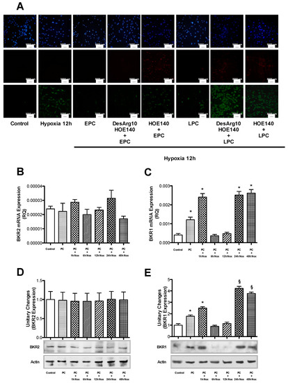 (A) Cells were subjected to prolonged hypoxia (12 h) after early and late preconditioning (EPC and LPC), in the absence and presence of selective bradykinin receptor 1 (BKR1) and 2 (BKR2) inhibitors (desArg10-HOE-140 and HOE-140, respectively). Cells were stained with Annexin-V (green), Propidium Iodide (PI, red) and DAPI (blue). The rates of apoptosis and necrosis were calculated by dividing the number of Annexin-V-positive/PI-negative cells and Annexin-V-positive/PI-positive cells, respectively, by the total number of nuclei detected with DAPI staining. The percentage of apoptotic and necrotic cell death was calculated from four independent experiments. Quantification of apoptosis and necrosis is reported in Table S2 of Supplementary Material. The size of the scale bar is 2000 µm. (B) The transcription of the mRNA coding for (B) BKR2 and (C) BKR1 was assessed at different times following PC (Nox: normoxia). The bar graph represents the mean ± SEM, expressed as the RQ value, from four independent experiments. The protein expression of BKR2 (D) and BKR1 (E) was assessed at different times following PC. The bar graph shows the mean ± SEM, expressed as the fold increase in BKR2 and BKR1 expression over that in control cells, of three independent experiments. Nox: normoxia. * p < 0.001 vs. control; § p < 0.001 vs. control and PC + 1 h Nox, by one-way ANOVA with a post hoc test of HSD.
