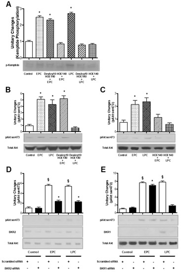 (A–C) Early and late preconditioned bAECs, in the absence and presence of selective bradykinin receptor 1 (BKR1) and 2 (BKR2) inhibitors (desArg10-HOE-140 and HOE-140, respectively), were harvested and lysed. The phosphorylation of kemptide (A) and Akt (B,C) was assessed. The bar graph represents densitometric analysis, with the mean ± SEM, expressed as fold increase in protein phosphorylation over that in control cells, of three independent experiments. (D,E) bAECs were transfected with bovine BKR2- and BKR1-short interfering RNA (BKR2-siRNA and BKR1-siRNA, 20 µg), then subjected to EPC and LPC. Akt phosphorylation at serine473 residues and BKR2 and BKR1 protein expression were assessed by immunoblotting. The bar graph represents densitometric analysis, with the mean ± SEM, expressed as fold increase in protein phosphorylation over that in control cells, of three independent experiments. EPC: early preconditioning; LPC: late preconditioning. * p < 0.001 vs. control; § p < 0.001 vs. control and siRNA transfection, by one-way ANOVA with a post hoc test of HSD.