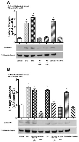 Finally, in order to demonstrate that, during PC, Bk induces crosstalk between PKA and Akt through BKR activation, we evaluated whether the pretreatment of bAECs with AP, desArg10-HOE-140 or HOE-140 abrogates the interaction between these two kinases. For this purpose, lysates from cells subjected to PC in the presence or absence of AP and BKR inhibitors were immunoprecipitated with antibodies against the PKA catalytic subunit and then blotted with anti-phospho-Akt (ser473) antibody. AP and HOE-140 abrogated crosstalk between PKA and phospho-Akt in both phases of PC (Figure 6A,B), whereas desArg10-HOE-140 only abolished this interaction in the late PC (Figure 6B).
