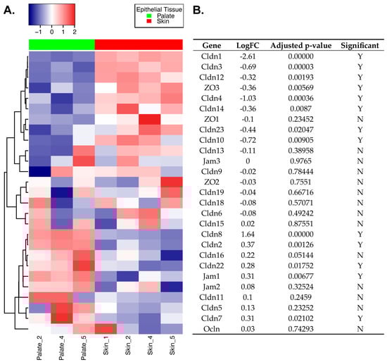Differential expression of tight junction molecules in primary mouse skin and oral epithelial cells. Skin epithelium obtained from the tails of mice were compared to oral epithelium obtained from the hard palate of mice using the R/Bioconductor package linear models for microarray data (limma). (A) Heatmap displaying gene expression profiles of the 27 tight junction (TJ) genes analyzed. Genes were hierarchically clustered using the Euclidean distance measure and complete clustering, with gene expression scaled across rows. Each row is a gene and each column is a sample. (B) Table of limma results for the corresponding 27 TJ genes analyzed. The gene column is aligned to match and annotate the corresponding heatmap in A (left). LogFC is the calculated log2 fold change between oral and skin epithelium, with positive values corresponding to over expression in palate and negative values corresponding to over expression in skin. Adjusted p-value is listed in the second column, and the third column identifies whether or not the gene was significantly differentially expressed (Y = yes, N = no) using an adjusted p-value of p < 0.05. n = 4 mice for skin and n = 3 mice for palate epithelium. Data from one of the palate samples (Palate_1) was excluded in this analysis due to its poor quality (see the Materials and Methods section).