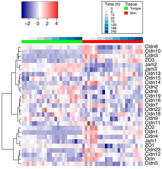 Differential expression analysis of tight junction molecules in mouse skin and oral wounds in vivo. A heatmap displaying the gene expression profiles of the 27 TJ genes analyzed in response to wounding over 10 days in both skin and tongue wounds. Genes were hierarchically clustered using the Euclidean distance measure and complete clustering, with gene expression scaled across rows. Each row is a gene and each column is a sample at a specific time point. Time 0 represents baseline expression in normal tissue, and subsequent time points represent hours after wounding. Samples are displayed in response to injury over time, going left to right for each tissue using a white–blue color scale bar, with tissues denoted by green or red color bars. n = 3 mice per group per time point for both skin and oral wounds.