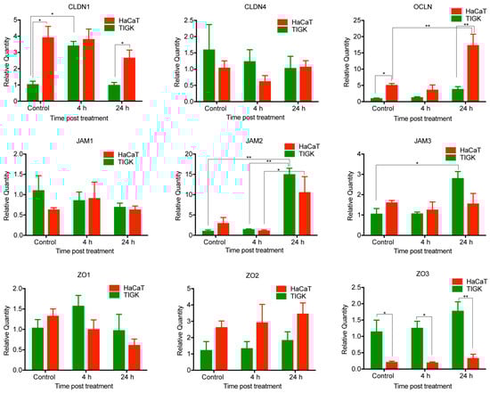 Differential expression of tight junction molecules after lipopolysaccharide (LPS) treatment in skin and oral keratinocytes. HaCaT and TIGK cells were cultured in a 12-well culture plate. The cells were treated with LPS (100 ng/mL) when reaching 80% confluency. mRNA expression of CLDN1, CLDN4, OCLN, JAM1, JAM2, JAM3, ZO1, ZO2, and ZO3 was examined at 4 and 24 h after treatment by Real-Time PCR. Control: untreated. n = 3 replicates, * p < 0.05, ** p < 0.01.