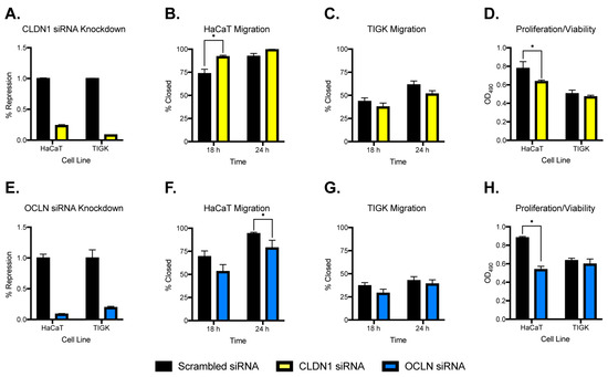 Migration and proliferation/viability of skin and oral keratinocytes after CLDN1 or OCLN knockdown. For migration assays, HaCaT and TIGK cells were transfected with claudin 1 or occludin small interfering RNA (siRNA). The transfected cells were cultured in 2-well silicone culture inserts with a defined cell-free gap as described in the Materials and Methods section. Cell migration was documented by a digital camera 18 and 24 h later. For proliferation/viability assays, 5 × 103 cells/well of claudin 1 or occludin siRNA-transfected HaCaT and TIGK cells were plated in a 96-well plate. A 3-(4,5-dimethylthiazol-2-yl)-5-(3-carboxymethoxyphenyl)-2-(4-sulfophenyl)-2H-tetrazolium, inner salt (MTS) proliferation assay was performed to record OD490 values corresponding to the numbers of live cells using a spectrophotometer. (A) CLDN1 knockdown in HaCaT and TIGK cell lines. (B,C) Migration after CLDN1 knockdown in HaCaT and TIGK cells, respectively. (D) Proliferation/viability after CLDN1 knockdown. (E) OCLN knockdown in HaCaT and TIGK cell lines. (F,G) Migration after OCLN knockdown in HaCaT and TIGK cells, respectively. (H) Proliferation/viability after OCLN knockdown. Black = scrambled siRNA, yellow = CLDN1 siRNA, blue = OCLN siRNA; n = 3 replicates, * p < 0.05.