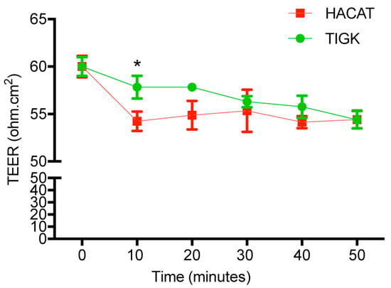 Histamine is one of the mediators released upon mast cell activation in response to injury [18,19,20]. It improves skin wound healing by enhancing basic fibroblast growth factor production, angiogenesis, and macrophage recruitment [21]. Histamine has been previously shown to disrupt epidermal barriers [22,23]. We hypothesized that histamine treatment would alter the permeability of HaCaT and TIGK cells. We used transepithelial electrical resistance (TEER) to quantitatively measure permeability levels of HaCaT or TIGK cells after histamine treatment (100 µM). After addition of histamine, TEER was reduced in both HaCaT and TIGK cells over the 50 min time course (Figure 6). However, the effect was more rapid in HaCaT cells with a significant decrease in TEER in as early as 10 min. These results suggest that skin keratinocytes are more sensitive to histamine in terms of their barrier function.