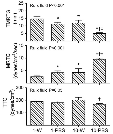 Interactions of RuCl3 concentration and fluid within which it is dissolved. Data are mean ± SD. 1-W = 1 µM RuCl3 in dH2O; 1-PBS = 1 µM RuCl3 in PBS; 10-W = 10 µM RuCl3 in dH2O; 10-PBS = 10 µM RuCl3 in PBS. * p < 0.05 vs. 1-W; † p < 0.05 vs. 1-PBS; ‡ p < 0.05 vs. 10-W via two-way ANOVA with Holm–Sidak post hoc test. Two-way ANOVA results for interaction of RuCl3 concentration and fluid are indicated within each panel.