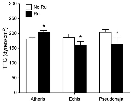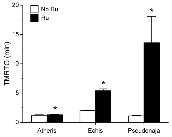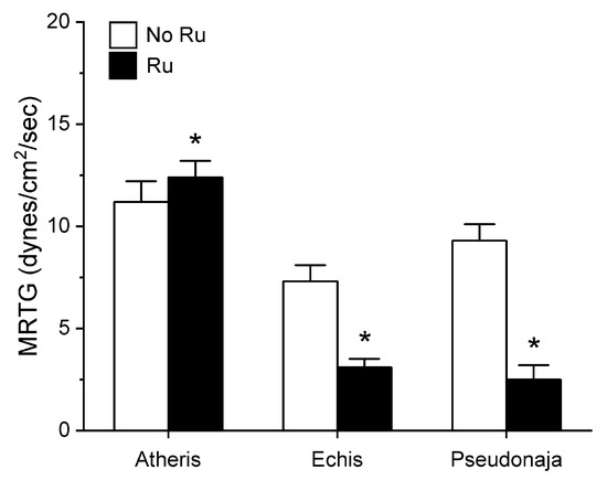 Effect of exposure of A. nitschei, E. leucogaster, and P. textilis venom to 100 µM RuCl3 in PBS on MRTG values in human plasma. Data are presented as mean ± SD. White bars = no RuCl3 exposure; black bars = 100 µM RuCl3 in PBS exposure. * p < 0.05 vs. no RuCl3 in PBS exposure via two-tailed, unpaired t-test.