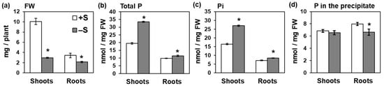 Sulfur deficiency increased phosphate (Pi) accumulation in Arabidopsis. (a) Fresh weights (FW), (b) total phosphorus (P) concentration, (c) Pi concentration, and (d) P concentration in the precipitate in shoots and roots of wild-type plants. Plants were grown for 10 days on MGRL agar media supplemented with 1500 μM (sulfur sufficiency (+S), white bar) or 15 μM sulfate (sulfur deficiency (−S), gray bar). In (b), plant samples were directly digested with concentrated nitric acid. In (c) and (d), plant tissues were extracted using 10 mM HCl. Then after transferring the supernatant to a new tube, the precipitate was digested with concentrated nitric acid. Digested plants (b), supernatant (c), and digested precipitate (d) were analyzed by ion chromatography. Bars and error bars indicate mean ± SE (n = 4). Asterisks indicate significant differences between +S and –S detected by Student’s t-test (* p < 0.05).