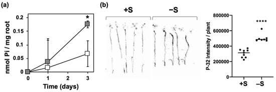 Furthermore, we analyzed the Pi uptake using the radioactive isotope of phosphorus (32P) ([45,46], Figure 2b). Plants grown for 10 days on +S or –S agar media were transferred to +S or –S hydroponic solution containing 32P. After 60 min, the intensity of 32P were significantly higher in plants subjected to –S comparing to that subjected to +S (Figure 2b), indicating an enhancement of Pi uptake as an early response to –S.