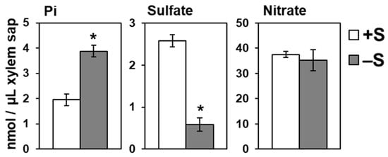 Increased Pi levels in xylem sap under –S. Wild-type (WT) plants were used. Twenty-day-old plants were transferred to hydroponic media supplemented with 1500 μM sulfate (+S) for 2 days before starting the treatment. For the treatment, plants were transferred to hydroponic media with (+S, white bar) or without (–S, gray bar) sulfate. Xylem sap was collected from decapitated stem after cutting the main stem when the main stem height reached approximately 3 cm for all plants. Bars and error bars indicate mean ± SE (n = 3). Asterisks indicate significant differences between +S and –S detected by Student’s t-test (* p < 0.05).