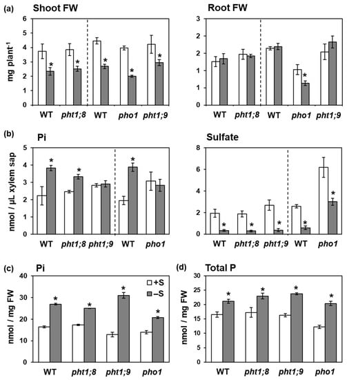 Considering their essential roles, plants have developed a series of complex and tightly controlled mechanisms, to meet the plant requirement of S and P in response to their availability. Recent studies have shown the effects of P deficiency (−P) on S metabolism and signaling, i.e., the increase in S and the transcript levels of several sulfate transporters by −P [13,14]; the involvement of PHOSPHATE STARAVATION RESPONSE 1 (PHR1), a key transcriptional factor for −P response, in the stimulation of interorgan sulfate transport under −P [14]; and the rapid replacement of phospholipids by galactolipids and sulfolipids under −P [15,16,17,18]. In contrast, S deficiency (−S) does not induce the replacement of sulfolipids by phospholipids in Arabidopsis [10]. The transcript levels of several –P-induced micro RNAs (miRs), miR399, miR827, and miR2111, which regulate −P responses, are downregulated under −S [19], vice versa, that of miR395 regulating sulfate transport and activation via the induction by −S is downregulated by −P [20]. Such changes in S homeostasis and signaling contribute to plant adaptation to −P. For example, the replacement of phospholipids by sulfolipids support the cell membrane under −P. Also, excessive accumulation of metals and reactive oxygen species occurs under −P, triggers the need for more antioxidants to cope with these hazardous substances [21,22]. S is essential for the production of phytochelatin and glutathione, a major antioxidant in plants [11]. The latter is known to increase under −P, contributing to plants’ adaptation to −P [23]. While studying the interactions between S and P have mostly focused on the influence of P availability on S metabolism and homeostasis [14,15,16,17,19,20], −S is also expected to affect the P metabolism and homeostasis. However, to this date, the effects of S availability on P metabolism and homeostasis have not yet been elucidated.