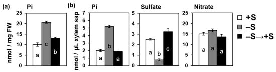 To confirm that the increased Pi accumulation in shoots and xylem sap was induced by –S, we investigated the effects of sulfate addition on Pi accumulation in plants subjected to –S (Figure 5). Twenty-day-old plants were transferred to –S or +S hydroponic media for 3 days before harvesting. A set from the plants transferred to –S hydroponic media was then transferred to +S media 2 days after the first transfer and kept there for 1 day (–S→+S). The increased Pi level by –S was terminated by the addition of sulfate in both shoots and xylem sap (Figure 5). Sulfate levels in the xylem sap decreased under –S and then increased again by the sulfate supply (Figure 5b). Nitrate levels in xylem sap were not influenced by S availability (Figure 5b). These results indicated that the Pi levels in shoots and xylem sap were influenced by S availability.