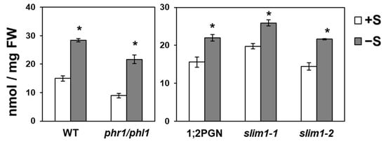 PHR1/PHL1 and SLIM1 are the main transcription factors regulating −P and −S responses, respectively [44,47,48]. Therefore, we further evaluated the possible involvement of PHR1/PHL1 or SLIM1 in regulating the −S-increased Pi accumulation in shoots using slim1-1, slim1-2, slim1 parental line PSULTR1;2-GFP (1;2PGN), and phr1/phl1 ([44,47,48,49], Figure 6). Pi levels in shoots of slim1 and phr1/phl1 mutants significantly increased under −S similar to that of 1;2PGN and WT plants (Figure 6), suggesting the existence of a different mechanism regulating −S-increased Pi accumulation in shoots.