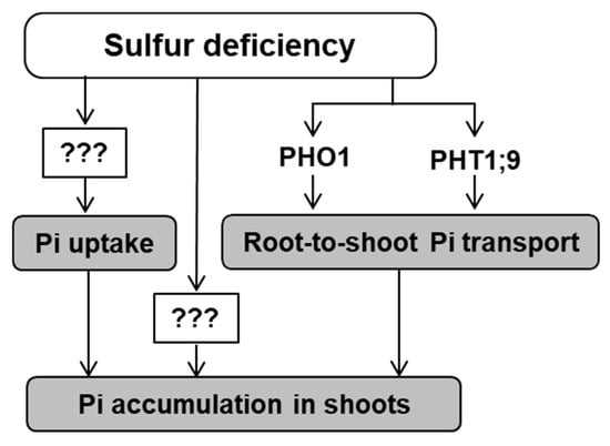 This study added to the existing knowledge a new aspect of the interaction between S and P, providing the first insight on the effects of −S on Pi uptake, transport, and accumulation. We identified the −S-increased Pi accumulation in shoots as a part of −S responses in plants. This accumulation was facilitated by increased Pi uptake and root-to-shoot transport under −S. The −S-increased Pi transport from root-to-shoot was regulated by PHO1 and PHT1;9. However, our results suggested a separate mechanism underlying the Pi accumulation in shoots. Studying the interaction points between S and P can provide a better understanding of these essential nutrients and highlights the importance of such interactions in plant adaptation to their deficiencies. It can provide a powerful tool for future improvement of plants growth and development. However, further investigations are still required to confirm the physiological meaning and to identify the molecular mechanism underlying the −S-increased Pi uptake and accumulation in shoots.
