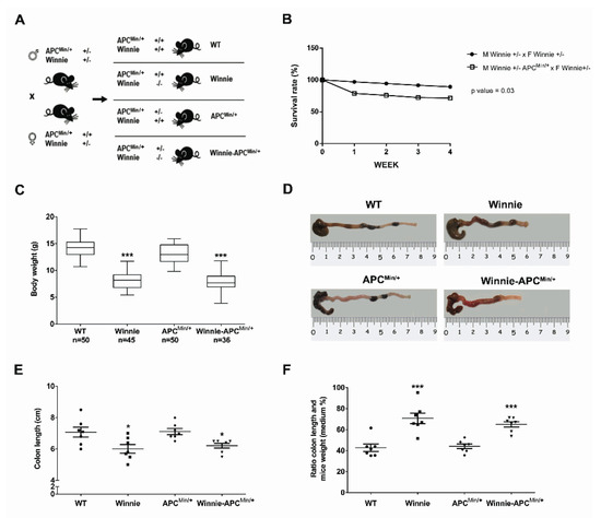 Creation and characterization of the Winnie-APCMin/+ murine model. (A) Breeding strategy used to obtain Winnie-APCMin/+ mice and the control littermates. (B) Impact of APCMin/+ mutation on survival rate in the breeding scheme of Winnie and Winnie-APCMin/+ mice. (C) Body weight analysis of 4-week-old Winnie-APCMin/+ mice and their relative controls. (D–F) Representative images of colon (D) and data analysis of colon length, and (E) colon length adjusted to body weight (F) for Winnie-APCMin/+ mice and control lines sacrificed at 5 weeks. (E,F): n = 7 animals/group. * p < 0.05, *** p < 0.001 compared to WT mice.