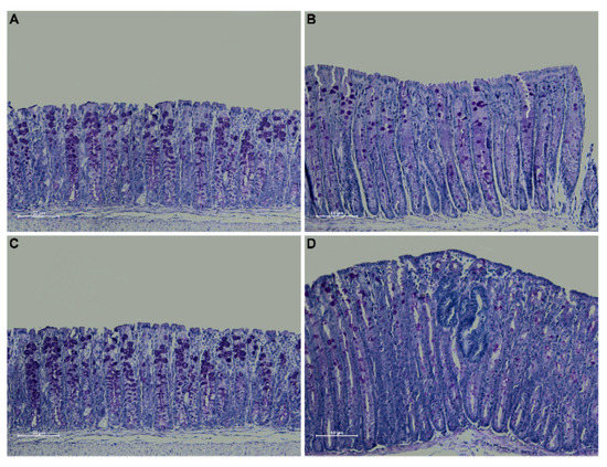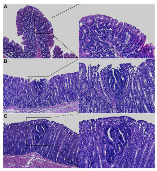 Tissue sections from the large intestine were fixed in 10% buffered formalin, dehydrated and paraffin-embedded. Three-micrometer-thick sections from the proximal, medial and distal colon were stained using a hematoxylin and eosin standard protocol. Colonic tissue sections were evaluated for neoplasia. PAS staining on distal colon sections was performed to identify mucins. Observations and imaging were performed with a Nikon Eclipse Ti2.