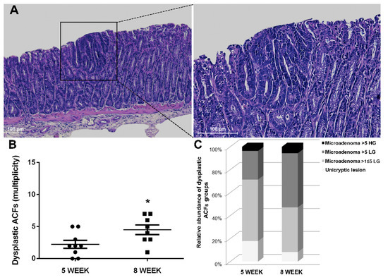 In line with the multi-step nature of CRC, we conducted histological characterization at a later time point to confirm the expected progression in the number of ACFs of 8-week-old Winnie-ApcMin/+ mice (Figure 5A,B).