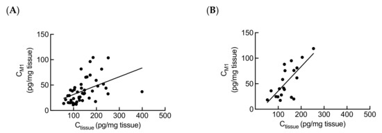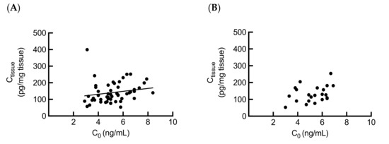Figure 2. Correlation between the tacrolimus C0 and Ctissue at (A) 3 months (n = 52, r = 0.3560, p = 0.0096) and (B) 1 year (n = 22, r = 0.3368, p = 0.1253) after transplantation. Statistical analyses were performed using Spearman’s correlation.