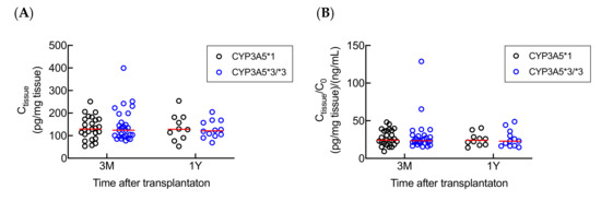 Figure 3. Effects of donor-CYP3A5 genotype on tacrolimus (A) Ctissue (3 months: p = 0.8845; 1 year: p = 0.6873) and (B) Ctissue/C0 (3 months: p = 0.7575; 1 year: p = 0.9229) at 3 months (n = 52) and 1 year (n = 22) after transplantation. Statistical analyses were performed using Mann–Whitney U test. Bar shows the median value in each group. (Abbreviations: 3M—3 months; 1Y—1 year).
