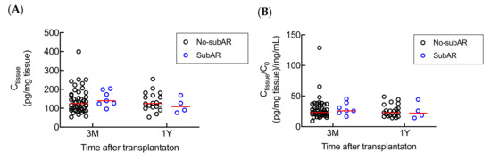 Figure 5. Differences in tacrolimus (A) Ctissue (3 months: p = 0.3287; 1 year: p = 0.5468) and (B) Ctissue/C0 (3 months: p = 0.3699, 1 year: p = 0.7743) among the no subclinical acute rejection (no-subAR) group and subAR group at 3 months (n = 52) and 1 year (n = 22) after transplantation respectively. Statistical analyses were performed using Mann–Whitney U test. Bar shows the median value in each group. (Abbreviations: 3M—3 months; 1Y—1 year).