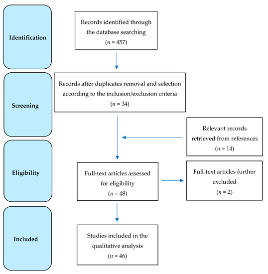 A total of 457 results were originally retrieved. Of these, 34 peer-reviewed publications were selected according to the above-mentioned inclusion and exclusion criteria. The examination of the references from relevant papers detected other 14 studies, whose analysis identified 12 additional articles fitting the purpose of this review. Therefore, a total of 46 papers were eventually included in this study (Figure 1) and the main findings are summarized in Table 1. More in details, 8 studies deal with serum biomarkers [9,10,11,12,13,14,15,16], 10 with cerebrospinal fluid (CSF) [17,18,19,20,21,22,23,24,25,26], 4 with neuroimaging [27,28,29,30], 6 with histopathology [31,32,33,34,35,36], and 14 with transcranial magnetic stimulation (TMS) [37,38,39,40,41,42,43,44,45,46,47,48,49,50]; 4 studies included more than one technique: one studied both serum and CSF markers [51], two both serum and neuroimaging [52,53], and one both CSF and neuroimaging [54].
