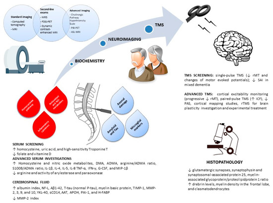 Some studies have identified serological markers that can support the diagnosis of VaD. For instance, pro-inflammatory metabolites (such as NO-related molecules), cytokines (including IL-1β, TNF-α, IFN-γ, IL-4, IL-5, IL-8, G-CSF, and MIP-1b), and markers of endothelial dysfunction (e.g., homocysteine) were found to be increased in VaD patients [11,16,51,52,53]. Furthermore, an altered systemic redox balance was demonstrated in VCI, in which reduced antioxidant enzymes, such as the activity of arylesterase and paraoxonase, were associated with the risk of developing dementia [13,14]. In addition, the concentrations of some CSF proteins can also help to distinguish among different forms of dementia. In particular, the analysis of a specific protein panel, including Aβ42/Aβ40 ratio, Aβ42, P-tau, T-tau, TIMP-1, NF-L, MMP-9, and MMP-2, was able to reliably distinguish VaD from either AD, LBD, or normal aging [19,20,21,105]. Further, a disruption of BBB integrity was demonstrated in VCI patients through the increase of the CSF/serum albumin ratio [54]. Notably, a BBB breakdown has been demonstrated also in AD [106], although, VCI patients had higher CSF albumin levels compared to AD. Moreover, among VCI subtypes, SIVD had the highest value of mean BBB permeability and albumin index, thus suggesting a linking role of BBB dysfunction between vascular lesion and tissue damage [54,107,108].