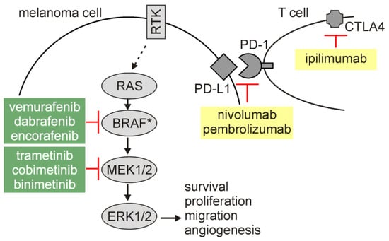 - Luebker, S.A.; Koepsell, S.A. Diverse mechanisms of BRAF inhibitor resistance in melanoma identified in clinical and preclinical studies. Front. Oncol. 2019, 9, 268. [Google Scholar] [CrossRef]