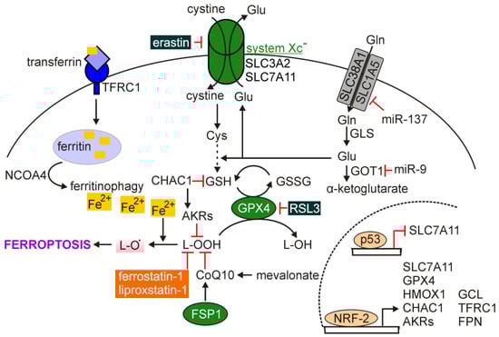 - Luo, M.; Wu, L.; Zhang, K.; Wang, H.; Zhang, T.; Gutierrez, L.; O’Connell, D.; Zhang, P.; Li, Y.; Gao, T.; et al. miR-137 regulates ferroptosis by targeting glutamine transporter SLC1A5 in melanoma. Cell Death Differ. 2018, 25, 1457–1472. [Google Scholar] [CrossRef]