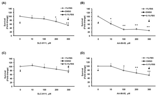 Survival curves of MDA-MB-231 and A549 cells exposed to CA-IX pharmacological inhibitors. MDA-MB-231 (A,B) and A549 (C,D) were treated with increasing concentrations [10–300 µM] of SLC-0111 and AA-06-05for 48 h, under experimental condition of medium with 1% FBS. Survival data were calculated as 540 nm relative absorbance/well. Data in the graphs are reported as fold change (means ± SD), giving 100% to the control condition of 1 % serum. (n = 3). * p < 0.05, ** p < 0.01 vs. untreated cells.