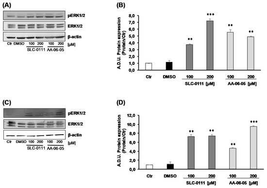 CA-IX pharmacological inhibitors increase the expression and activation of p-ERK1/2. MDA-MB-231 (A,B) and A549 (C,D) were treated with SLC-0111 and AA-06-05 [100–200 µM] for 30 min. The treatments were performed under experimental condition of medium with 1% FBS. Signals were evaluated through western blot and β-actin was used to normalize protein loading. For each experimental condition Arbitrary Densitometry Units (A.D.U.) ± SD were reported as pERK1/2/total ERK1/2 vs basal control. (n = 3). ** p < 0.01 and *** p < 0.001 vs. untreated cells (Ctr).