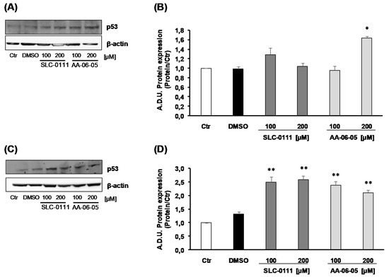 Based on the ability of p-ERK1/2 to activate p53 [22,23,24], we investigated the expression of this key protein in the apoptotic cascade. In our experiments p53 maximum level was observed after 60 min of incubation with the CA-IX pharmacological inhibitors (Figure 4). Data showed that the expression of p53 increased with 200 µM AA-06-05 in MDA-MB-231 (Figure 4A,B) and with 100 and 200 µM SLC-0111 and AA-06-05, compared to controls inA549 (Figure 4C,D).