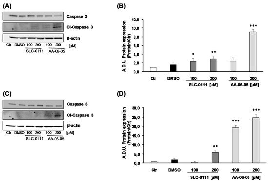 Phosphorylated ERK1/2 allows the activation of the typical apoptotic factor, p53 [22,23,24], which expression is assessed in both tumor cell lines after 1 h of treatment with SLC-0111 and AA-06-05. According to the modulation of pERK1/2, an increase of p53 expression is overall evident, but no clear concentration dependent effect could be seen probably because the effect is already at the plateau. The trend of p53 expression shows a pERK1/2-indipendent modulation, because p53 may also be affected by other apoptotic factors, which remain to be investigated. If apoptotic process proceeds, Caspase 3 activation allows the definitive cell death. Indeed, this protein is activated by its cleavage and arrests the inhibition of particular transcription factors, whose action cause the degradation of nucleosome, last event of the apoptotic process [32]. A visible increase of cleaved Caspase 3 is evident in both tumor cells, after incubation for 4 h with AA-06-05, while in MDA-MB-231 the activation of Caspase 3 is visible also with the highest concentration of SLC-0111.