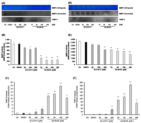 Zymographic analysis of conditioned medium from cultured MDA-MB-231 and A549 cells treated with CA-IX pharmacological inhibitors. Tumor cells were treated with increasing concentrations of SLC-0111 [50–200 µM] and AA-06-05 [25–200 µM], in serum-free medium. Conditioned medium was collected, in triplicate, after 48h and analyzed by gelatin zymography. MMP-2 activity in conditioned media of MDA-MB-231 (A,B) and A549 (D,E) was assessed as lysis bands on blue background and quantified in the inverted images as optical density (± SD)/total proteins in the sample. (n = 3). * p < 0.05, ** p < 0.01 and *** p < 0.001 vs. untreated cells (Ctr). Western blot analysis was performed in parallel experiments to evaluate the release of TIMP-2 in the conditioned medium of MDA-MB-231 (C) and A549 (F). For each experimental condition TIMP-2 release was reported as optical density (± SD)/total proteins in the sample vs. basal control. (n = 3). * p < 0.05, ** p < 0.01 and *** p < 0.001 vs. untreated cells (Ctr).
