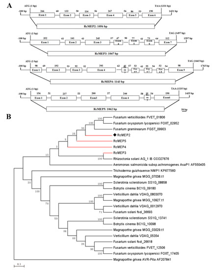 Gene structures of RcMEP2-RcMEP5, four M35 metalloproteases in Rhizoctonia cerealis, and their phylogenetic relationships. (A) Exons and introns are indicated by boxes and dash lines, respectively. (B) Phylogenetic relationship among RcMEP2-RcMEP5 and 21 other M35 family metalloproteases from other pathogenic fungi and the fish pathogenic bacterium Aeromonas salmonicida subsp. Achromogenes. The phylogenetic tree was constructed by Mega 7.0 using neighbor-joining (parameters: 1000 bootstraps).