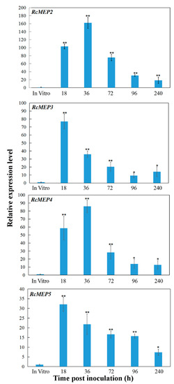 Transcriptional profiles of RcMEP2-RcMEP5 genes in Rhizoctonia cerealis during the infection to wheat. The R. cerealis Actin gene was used as an internal control to normalize the data. The relative transcriptional abundances of RcMEP2-RcMEP5 were examined during the infection process to wheat stems/sheaths, including five different infection time points (18, 36, 72, 96, and 240 h post inoculation (hpi)) and compared to in vitro culturing. Error bars were calculated based on three replicates. Asterisks indicate significant difference (** p < 0.01 or * p < 0.05, t-test) between the pathogen-inoculated sample and in vitro culturing.