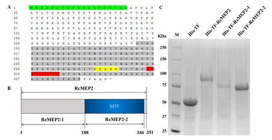 Protein structure of RcMEP2 and heterologous expression of RcMEP2 and its M35-containing/deleting mutants. (A) The deduced amino acid sequence of RcMEP2. Green part represents the signal peptide, yellow highlight indicates the HEQSH motif, the red indicates another motif GTQDVVYG, the M35 domain is marked by the grey. (B) Schematic view of the RcMEP2 and M35-containing/deleting domain proteins that are heterologously-expressed in Escherichia coli cells. (C) Sodium dodecyl sulphate-polyacrylamide gel electrophoresis (SDS-PAGE) patterns of the heterologous-expressing and purified proteins of His-TF-RcMEP2, His-TF-RcMEP2-1 (the M35 domain-deleting peptide), and His-TF-RcMEP2-2 (the M35 domain-containing peptide).