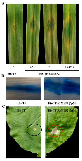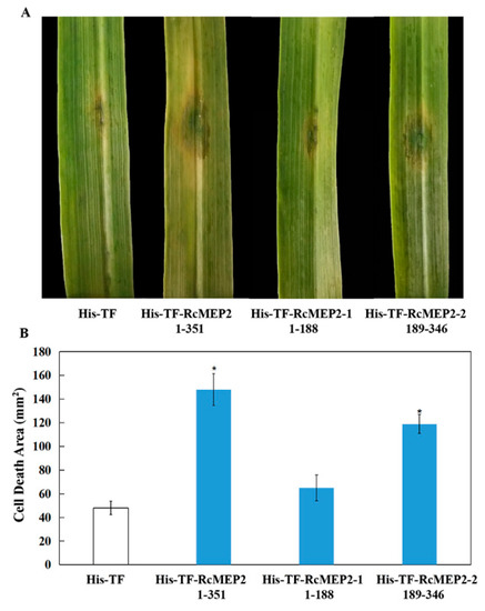 To determine if the M35 domain of RcMEP2, named RcMEP2-2, is required for the cell death-inducing activity, these His-TF-RcMEP2, His-TF-RcMEP2-1, and His-TF-RcMEP2-2 proteins were infiltrated into wheat leaves with the same concentration (5 µM), respectively. The results displayed that similar necrosis sizes were observed with the His-TF-RcMEP2 and His-TF-RcMEP2-2, but His-TF and His-TF-RcMEP2-1 without the M35 domain could not induce obvious necrosis/cell death (Figure 5A,B). These data clearly suggest that this M35 domain is necessary for the cell death-inducing activity of this metalloprotease RcMEP2.