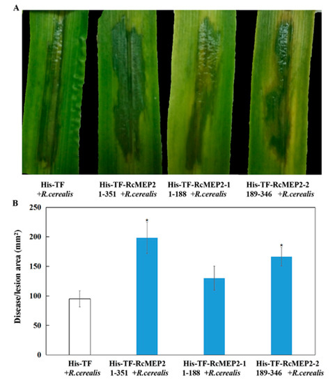 In a detached-leaf inoculation assay, fully expanded secondary leaves of the susceptible wheat cv. Wenmai 6 at the tillering stage were infiltrated with 5 µM of His-TF-RcMEP2, His-TF-RcMEP2-1, or His-TF-RcMEP2-2. After these proteins, His-TF-RcMEP2, His-TF-RcMEP2-1, and His-TF-RcMEP2-2 were infiltrated for 6 h, the leaves with the completely absorbed proteins were inoculated with 50 µL mycelium suspension of Rc207. The leaves were then placed in Petri dishes containing filter paper saturated with sterile distilled water and kept under a 16 h day/8 h night regime at 25 °C. Pictures of the lesions were taken 3 days after infiltration with Rc207 mycelium suspension, and the lesion areas were measured and calculated by length × width. Six leaves were used in each experiment and three repeats were done.