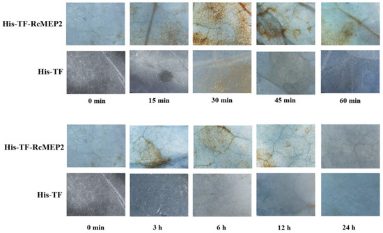 The excessive accumulation of ROS may promote plant cell death. Hydrogen peroxide (H2O2) is a major type of ROS. Here, we assayed if His-TF-RcMEP2 protein triggers H2O2 excessive accumulation when infiltrated in the N. benthamiana leaves. The diaminobenzidine (DAB) staining for H2O2 detection was observed and photographed under a stereomicroscope. As shown in Figure 8, H2O2 excessive generation was detected from 15 min to 12 h after infiltration with His-TF-RcMEP2, mainly concentrated in the veins and stomata of the treated N. benthamiana leaves. The highest accumulation of H2O2 occurred at 30 min after infiltration, suggesting that the excessive generation of H2O2 triggered by RcMEP2 is rapid. Nonetheless, no obvious accumulation of H2O2 appeared in the veins and stomata of His-TF infiltrated leaves (Figure 8).