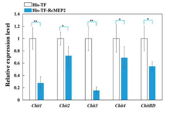 Inhibition of RcMEP2 on the transcription of wheat chitinases. Both samples were derived from the susceptible wheat cv. Wenmai 6 leaves at three days after inoculation with the His-TF-RcMEP2 and the His-TF (CK) at a concentration of 5 µM. The wheat Actin gene was used as an internal control to normalize the data. Error bars (SE) were calculated based on three replicates. Asterisk * indicates significant difference (** p < 0.01 or * p < 0.05, t-test) between His-TF-RcMEP1 treatment and His-TF (CK) treatment.