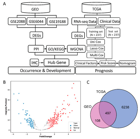 (A) Flow chart of the present study. (B) Volcano plots of differentially expressed genes (DEGs) in Gene Expression Omnibus (GEO) samples. X–axis represents the fold change of gene expression, and y-axis stands for adjusted p value. The red and blue dots in the plot represent statistically significant up- and down-regulated genes. (C) Venn diagrams of DEGs of the GEO datasets and The Cancer Genome Atlas (TCGA) dataset.