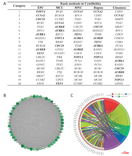 (A) Hub genes for highly expressed genes ranked by different CytoHubba methods. Bold gene symbols were the overlap genes in top 20 by five ranked methods. EPC: Edge percolated component; MCC: Maximal cilque centrality; MNC: Maximal neighborhood component; Degree: Node connect degree, Closeness: Node connect closeness. (B) The most significant module of the protein–protein interaction (PPI) network. Node size is positively related to degree of expression and the gradation of color positively associated with the expression level of this gene. (C) Gene ontology (GO) analysis of the most significant module in PPI analysis.