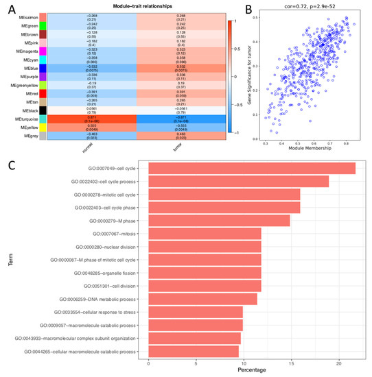(A) Gene modules and phenotypes quantified using Boolean variables (1 represents occurrence, 0 represents no occurrence) were used to calculate correlation coefficients, represented as a heat map. p-values are displayed in brackets. (B) Gene correlation scatter plots of the blue module. X-axis represents molecule membership, i.e., Pearson correlation coefficients of gene and module (MM). Y-axis represents the importance of the gene for the phenotype, i.e., Pearson’s correlation coefficient of gene and phenotype (GS: phenotype is represented by a Boolean variable). In the blue module, the upper quartile value of MM and GS were 0.683 and 0.390. (C) GO analysis of blue module. The y-axis shows significantly enriched GO terms, and x-axis represents the percentage of gene enrichment in this term.